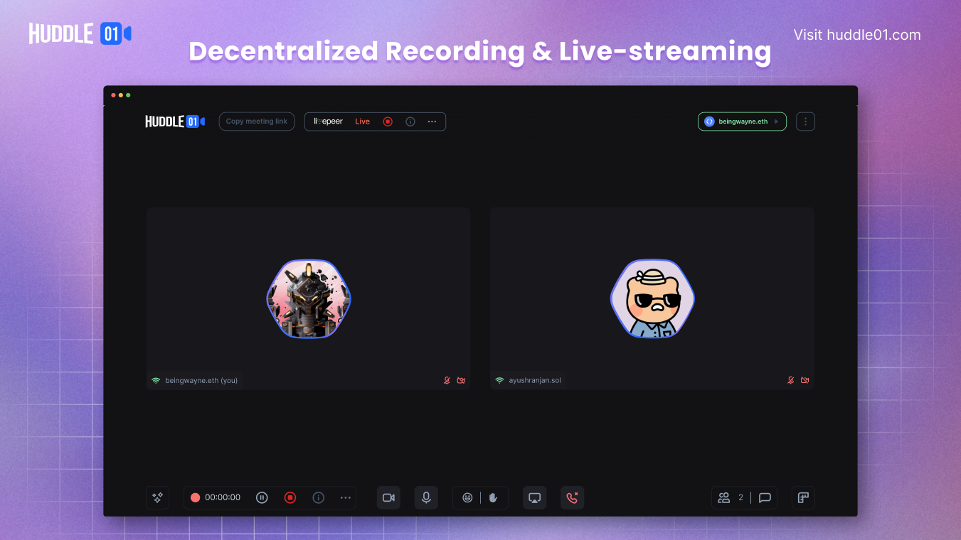 Huddle01 is a new video conferencing software native to Web3 and is comparable to a decentralized version of Zoom. It supports conversations for NFT communities, DAOs, Builders and also has features such as token gating, NFTs as avatars, Web3 Login + ENS and recording over IPFS.